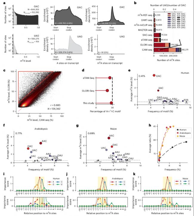 研究者還對擬南芥和玉米的RNA樣本進行了分析,發現RAC motif在這些植物中也是最富集的m6A修飾motif。然而,與人類樣本不同的是,RAC motif僅占植物中所有m6A位點的40%,而在人類樣本中約為85%。此外,植物中AAC motif豐度最高,而在人類中則是GAC motif豐度最高。這些結果表明,植物中的m6A修飾模式與人類存在差異,可能與植物中m6A修飾的調控機制有關。