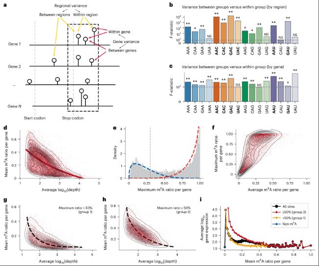 a. 插圖展示了A位點的區域和基因分布如何影響基因中m6A修飾水平的變異。