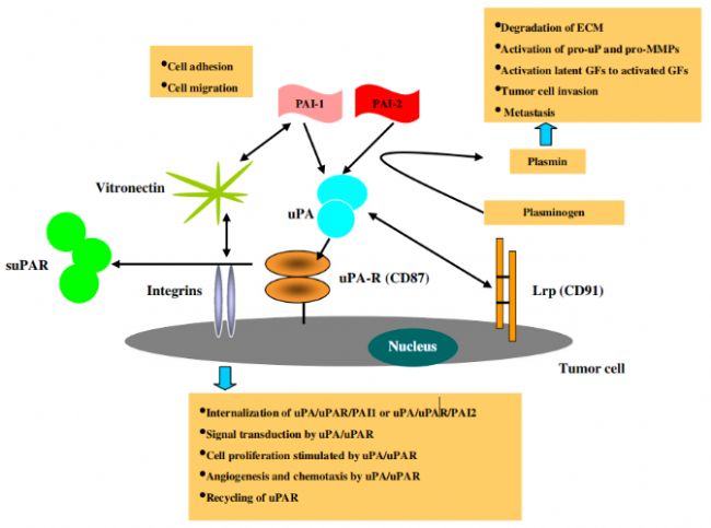 上皮細胞衍生的黏附分子(uPA/uPAR)及其下游效應在腫瘤轉移過程中的作用機制。uPA系統在涉及局部蛋白水解級聯、降解細胞外基質(ECM)以及最終腫瘤細胞侵襲和轉移的過程中發揮關鍵作用。uPA/uPAR的作用受到PAI1和PAI2的調控。惡性實體腫瘤中uPA/uPAR作用機制的示意圖。GF,生長因子;LRP,脂蛋白受體相關蛋白;MMP,基質金屬蛋白酶;PAI1,血漿型纖溶酶原激活物抑制劑;PAI2,血漿型纖溶酶原激活物抑制劑2;suPAR,可溶性尿激酶型纖溶酶原激活物受體;uPA,尿激酶型纖溶酶原激活物;uPAR,尿激酶型纖溶酶原激活物受體。
