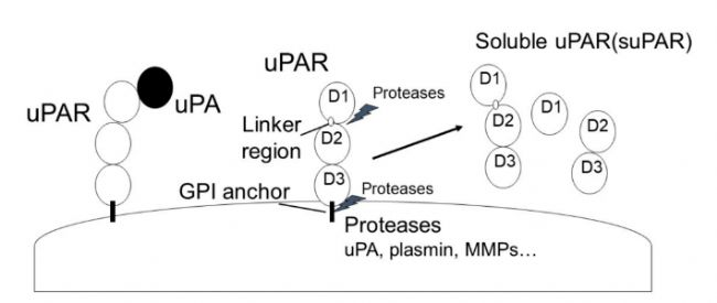 uPAR是一種糖蛋白,具有酶結合活性、蛋白質結構域特異性結合活性和信號受體結合活性。根據其表達形式的不同,uPAR蛋白可以是全長形式,也可以是特定結構域(如Domain 1)的截斷形式。全長uPAR蛋白包含多個功能區域,如N端胞外域,該區域負責與SORL1等蛋白質的結合,形成復雜的三元復合物,影響PLAUR(PLAUR,即uPAR的人類直系同源物,與類風濕性關節炎相關)的內化。