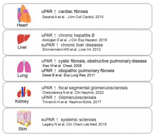 uPAR廣泛表達于多種組織和細胞中,包括蛻膜、脾臟等結構&纖維細胞、單核細胞、巨噬細胞、角質形成細胞、神經元、EC 和平滑肌細胞,炎癥可誘導 uPAR 表達。作為質膜的一個組成部分,uPAR在細胞表面發揮著關鍵作用。此外,uPAR的表達水平在不同生理和病理狀態下有所變化,據報道,在許多纖維化相關疾病中均觀察到 uPAR 表達增加,包括心臟纖維化、特發性肺纖維化和 SSc。