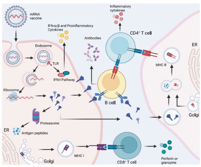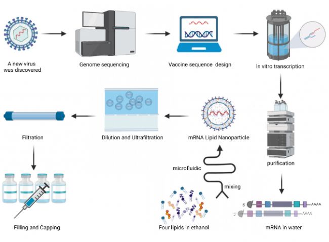 mRNA 疫苗的設計取決于目標病原體抗原序列的定義。通過確定目標抗原并優化其編碼序列,mRNA 可以通過 RNA 聚合酶在體外轉錄。合成的 mRNA 通過不同的工藝純化,然后使用微流控技術與脂質相混合并封裝成 mRNA‑脂質納米顆粒 (mRNA‑LNP) 復合物。隨后,通過稀釋和超濾濃縮完成 LNP 的自組裝。最后,經過無菌過濾、灌裝和封蓋,即可獲得 mRNA 疫苗。