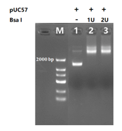 Lane 2 1μg pUC57 add 1U BsaⅠLane 3 1μg pUC57 add 2U BsaⅠ