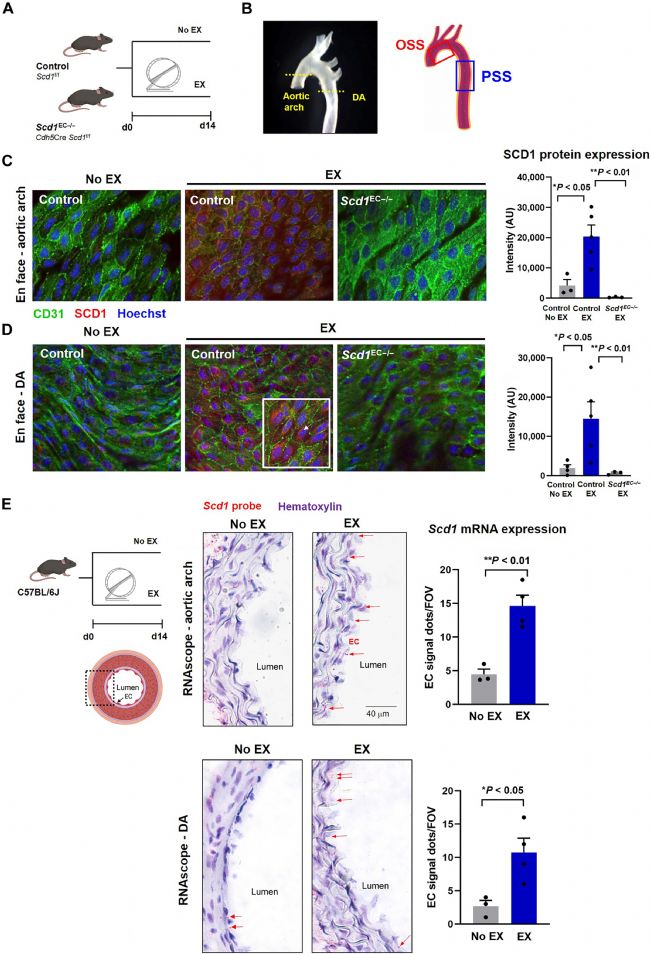 為了證明運動介導的代謝物,在自主輪式跑步 24 小時之前和之后立即對雄性野生型 C57BL/6J 小鼠進行了非靶向代謝組學分析,發現運動后血漿 OA 顯著增加,PA 有增加趨勢。PCA 顯示,運動前后脂質代謝物有明顯的分離。2 周后,主動脈內皮的面部免疫染色顯示,SCD1 在主動脈弓的小曲率和降主動脈中的表達增加(圖1 B、C)。SCD1 染色在亞細胞核周區突出,但在 SCD1內皮特異性缺失小鼠(Scd1EC-/-)中不存在。與 Scd1 特異性探針的原位雜交(RNAscope)證實了,運動后野生型小鼠主動脈弓和降主動脈中內皮 SCD1 表達增加(圖1 E)。這些數據表明,運動增強的 PSS 與激活內皮 SCD1 表達有關。