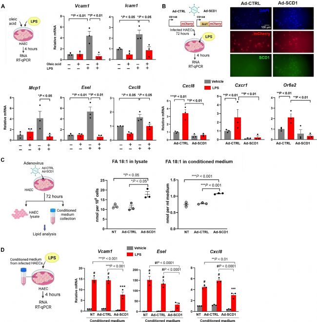 然后,通過基于腺病毒的重組系統過表達內皮細胞 SCD1,以證明 Cxcl8 及其受體 Cxcr1 和嗅覺受體2(Or6a2)mRNA 表達的降低(圖2 B)。脂質組學分析顯示,SCD1 過表達后,細胞內組分和條件培養基中的 OA 濃度均增加(圖2 C)。PCA 分析顯示,與對照細胞相比,SCD1 過表達改變了脂質組學特征,并增加了甘油三酯中的 MUFA 含量。過表達 SCD1 的 HAEC 條件培養基減輕了 LPS 誘導的 HAECs 中炎癥基因表達(圖2 D),表明細胞內和細胞外 OA 都賦予抗炎反應。