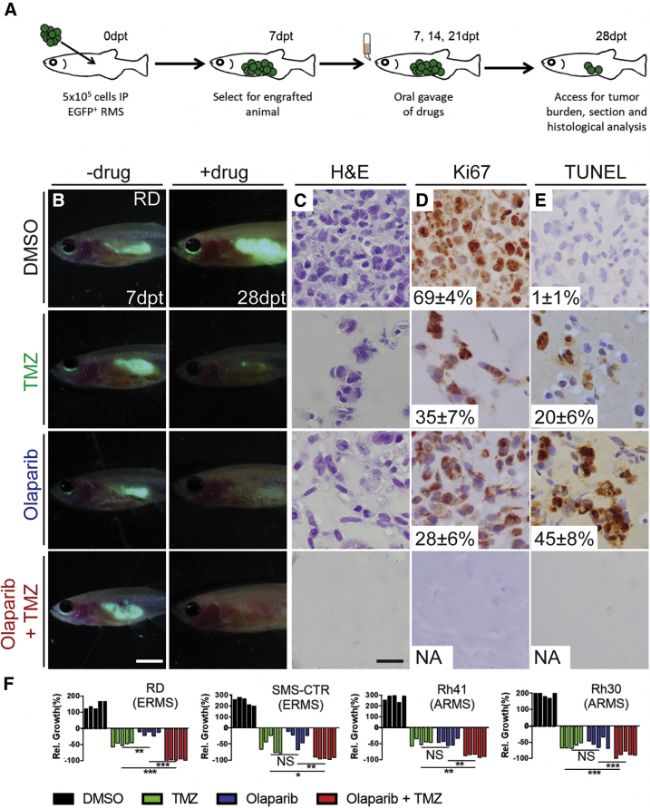 圖2. Combination Treatment of Temozolomide and Olaparib PARP Inhibitor Reduces Growth of Human RMS Cells in Engrafted prkdc−/−, il2rga−/− Zebrafish