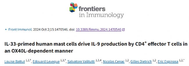 參考文獻(xiàn):Battut L, Leveque E, Valitutti S, Cenac N, Dietrich G, Espinosa E. IL-33-primed human mast cells drive IL-9 production by CD4+ effector T cells in an OX40L-dependent manner. Front Immunol. 2024 Oct 2;15:1470546. doi: 10.3389/fimmu.2024.1470546. PMID: 39416773; PMCID: PMC11479898.