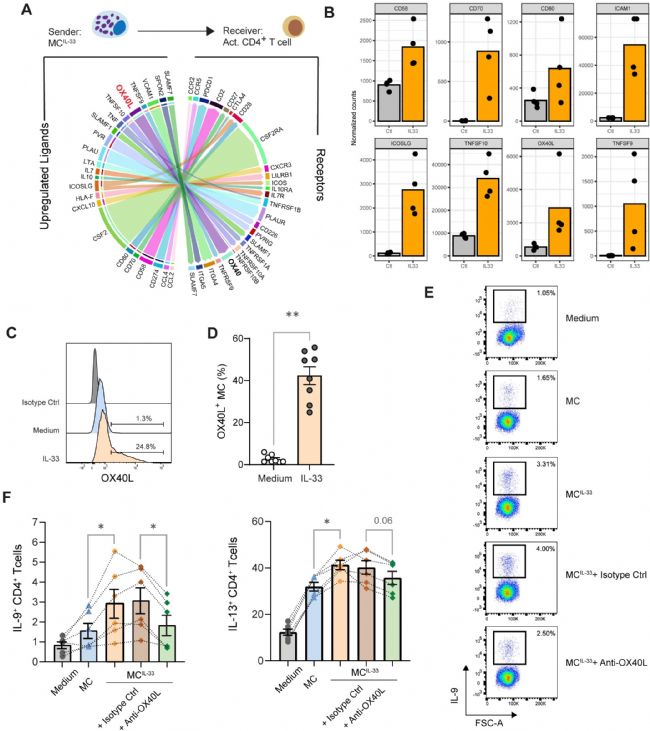 由于 IL-33 賦予 MCs 促進(jìn) Th 細(xì)胞產(chǎn)生 IL-9 的能力,因此接下來(lái)試圖闡明這種現(xiàn)象的潛在機(jī)制。研究人員探討了 IL-33 刺激后 MCs 中上調(diào)的基因是否可能在 MCs 和活化的記憶 CD4+ T 細(xì)胞之間的相互作用中發(fā)揮作用。基于RNAseq 數(shù)據(jù)和公開(kāi)數(shù)據(jù)集檢索,發(fā)現(xiàn) IL-33 在 MCs 中上調(diào)了參與 T 細(xì)胞共刺激的幾種分子的表達(dá),如 CD80、CD58、ICAM1 和 TNF 超家族(TNFSF)分子 CD70(TNFSF7)、OX40L(TNFSF4)和 CD137L(TNFSF9)(圖2 A、B)。在這些分子中,實(shí)驗(yàn)專注于 OX40L,因?yàn)樗蛔C明與 Th2 驅(qū)動(dòng)有關(guān)。