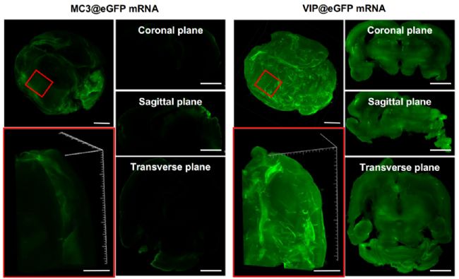 最后,研究人員對新型載體攜帶mRNA藥物的能力進(jìn)行測試。相比于現(xiàn)在市場上主流的D-Lin-MC3-DMA(一種可電離的陽離子脂質(zhì), 是有效的藥物遞送載體,簡稱MC3),VIP具有更好的藥物承載能力,同時(shí)對血腦屏障的滲透能力更強(qiáng),促進(jìn)藥物更高效地吸收。在這里,作者使用PEGASOS方法進(jìn)行組織透明化,獲得3D全腦成像,并以此對比兩種藥物遞送方法。由于攜帶的小型mRNA藥物帶有eGFP熒光標(biāo)記,故可以從熒光分布的強(qiáng)度與廣度比較兩個(gè)藥物載體的運(yùn)載能力。成像結(jié)果發(fā)現(xiàn)VIP方法的遞送效率高于傳統(tǒng)的MC3方法。