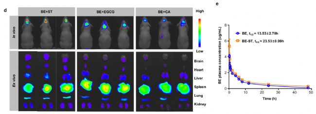 圖4. d圖,注射BE-有機(jī)酸復(fù)合物(BE+ST;BE+EGCG;BE+CA)后 1 小時(shí),帶有熒光標(biāo)記藥物在體內(nèi)和離體成像。e圖,靜脈內(nèi)給藥后 SD 大鼠 BE 和 BE-ST 的血漿濃度-時(shí)間曲線 。