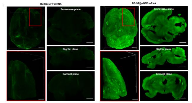 在這項(xiàng)工作中,PEGASOS透明化技術(shù)同樣起到了重要的作用。下圖顯示的是BE-ST與現(xiàn)在市場上主流的D-Lin-MC3-DMA(一種可電離的陽離子脂質(zhì), 是一種有效的藥物遞送載體,MC3)在透明大腦中分布情況,明顯看出BE-ST@eGFP mRNA的分布優(yōu)于MC3@eGFP mRNA.