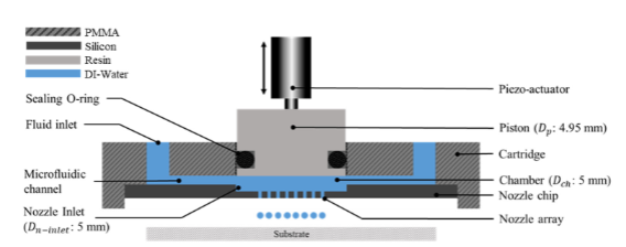 - 3.液滴噴射:實驗時,腔室內活塞直接推動液體,在壓電疊堆致動器精確控制下液滴從噴嘴陣列穩定噴射。活塞上下運動循環作業,向下推動液體形成液滴,向上則使腔室重新填充液體,維持連續穩定的液滴噴射。