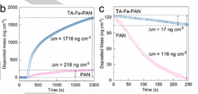 吸附與脫附定量:TA-Fe層對胺單體(Pa)的吸附量達1718 ng/cm²,是普通基底的8倍,脫附速率則降低7倍,證實其可有效減緩單體擴散。