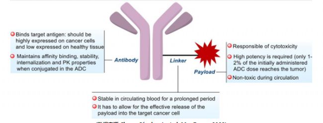 有效載荷(Payload)發(fā)揮ADC的細(xì)胞內(nèi)細(xì)胞毒活性,通過接頭部分與抗體共價結(jié)合的細(xì)胞毒性劑的性質(zhì)非常重要,因?yàn)槠渥饔脵C(jī)制將決定所得ADC作為抗癌化合物的效力及其可能的適應(yīng)癥。理想的有效載荷具備以下特點(diǎn):具有足夠高的細(xì)胞毒性;具有足夠低的免疫原性;具有高穩(wěn)定性;具有可修改的功能組,而不會顯著影響其效力;具有旁觀者殺傷效應(yīng);具有適當(dāng)?shù)乃苄裕话悬c(diǎn)應(yīng)為細(xì)胞內(nèi),因?yàn)榇蠖鄶?shù)ADC需要進(jìn)入腫瘤細(xì)胞才能釋放其有效載荷。