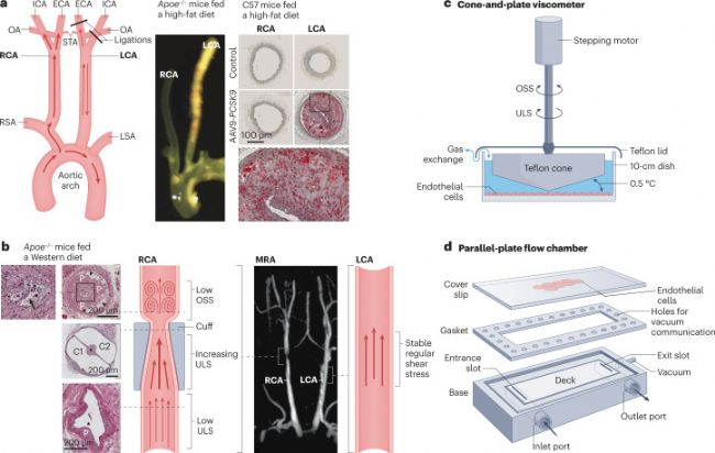 臨床觀察強(qiáng)烈表明,血流紊亂與動(dòng)脈粥樣硬化發(fā)生部位之間存在相關(guān)性,但其是否直接導(dǎo)致動(dòng)脈粥樣硬化一直是未知的,直到在動(dòng)物模型的實(shí)驗(yàn)研究中得到證實(shí)。在部分頸動(dòng)脈結(jié)扎術(shù)(PCL)模型中,左頸動(dòng)脈(LCA)誘導(dǎo)血流紊亂,具有典型的低幅度 OSS 模式(圖2 a)。在高脂飲食誘導(dǎo)高膽固醇血癥的Apoe−/− 小鼠或過(guò)表達(dá)PCSK9的C57BL/6小鼠中,PCL 手術(shù)在 2-3 周內(nèi)導(dǎo)致整個(gè) LCA 長(zhǎng)度的動(dòng)脈粥樣硬化快速發(fā)展。重要的是,在該小鼠模型中,對(duì)側(cè)右頸動(dòng)脈(RCA)繼續(xù)暴露于穩(wěn)定的血流中,且不會(huì)形成動(dòng)脈粥樣硬化斑塊,是同一動(dòng)物的理想對(duì)照(圖2 b)。此外,收縮頸動(dòng)脈袖帶模型涉及在 RCA 的一部分上植入剪切應(yīng)力修改模型(圖2 b),它將 RCA 的該部分暴露于三種不同的剪切應(yīng)力狀態(tài)下:低幅度、穩(wěn)定的血流,這會(huì)誘導(dǎo)易損斑塊的發(fā)展;高幅度、穩(wěn)定的血流,無(wú)斑塊形成;以及紊亂血流,這會(huì)導(dǎo)致穩(wěn)定性斑塊的發(fā)展。該小鼠模型顯示了單頸動(dòng)脈內(nèi)血流依賴性動(dòng)脈粥樣硬化的發(fā)展(圖2 b)。這兩種動(dòng)物模型已在全球眾多實(shí)驗(yàn)室中使用,是研究體內(nèi)血流依賴性內(nèi)皮細(xì)胞功能和動(dòng)脈粥樣硬化機(jī)制的極其有價(jià)值的工具。
