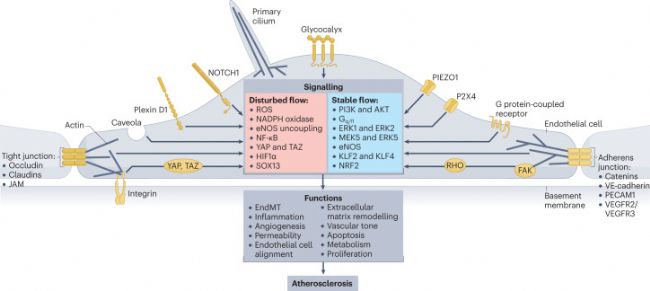動(dòng)脈粥樣硬化是一種主要影響動(dòng)脈的多因素慢性炎癥性疾病。內(nèi)皮細(xì)胞功能障礙和炎癥在動(dòng)脈粥樣硬化的發(fā)生和進(jìn)展中起著至關(guān)重要的作用。血管內(nèi)層的內(nèi)皮細(xì)胞與血液直接接觸,并因各種風(fēng)險(xiǎn)因素(如高膽固醇血癥、糖尿病、高血壓、吸煙和衰老)而變得功能失調(diào)和發(fā)炎,尤其是在與血流紊亂相關(guān)的特定動(dòng)脈粥樣硬化易發(fā)區(qū)域。這些區(qū)域的擾動(dòng)流的特征是向內(nèi)皮細(xì)胞表面?zhèn)鬟f低幅度的振蕩剪切應(yīng)力(OSS)。內(nèi)皮細(xì)胞通過(guò)機(jī)械感應(yīng)受體(機(jī)械傳感器)檢測(cè)各種剪切應(yīng)力模式和幅度,并將這些機(jī)械信號(hào)轉(zhuǎn)化為細(xì)胞信號(hào)和隨后的結(jié)構(gòu)和功能反應(yīng)。