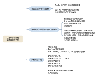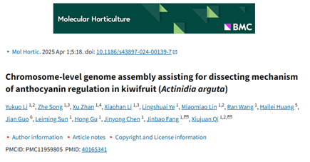2025年4月,中國農業科學院鄭州果樹研究所齊秀娟團隊在Molecular Horticulture(IF=10.6)期刊發表了題為 “Chromosome-level genome assembly assisting for dissecting mechanism of anthocyanin regulation in kiwifruit (Actinidia arguta)”的研究論文,該研究組裝了首個全紅型四倍體軟棗獼猴桃基因組,利用DAP-seq技術揭示了AaBEE1-AaLDOX色澤調控模塊,為揭開軟棗獼猴桃果實紅色形成的奧秘、改良獼猴桃色澤品質奠定了堅實基礎。