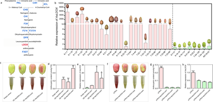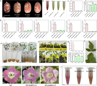 隨后對不同顏色的軟棗獼猴桃品種進行RNA-seq分析,并結合亞細胞定位結果,篩選出花青素調控相關的候選轉錄因子AaBEE1。經紅色軟棗獼猴桃果實中瞬時過表達,以及在擬南芥、番茄和煙草中穩定遺傳轉化實驗驗證,AaBEE1能夠抑制花青素的生物合成和積累。