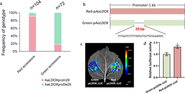 研究發現,AaLDOX在紅色軟棗獼猴桃種質中高表達,在綠色種質中低表達。對軟棗獼猴桃果實進行AaLDOX的瞬時過表達和沉默實驗,結果表明過表達AaLDOX可加速紅色色素積累,沉默AaLDOX則抑制積累,進一步證實AaLDOX是花青素生物合成的關鍵基因。對AaLDOX啟動子進行克隆分析和LUC實驗驗證,發現AaLDOX啟動子上的29-bp indel變異是決定果實紅綠顏色差異的關鍵因素,該變異可影響啟動子活性,進而調控AaLDOX的表達。