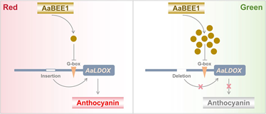 綜上所述,本研究成功組裝了首個全紅軟棗獼猴桃染色體水平參考基因組,揭示了AaBEE1-AaLDOX模塊調控花青素的機制,發現了與顏色表型相關的29-bp indel變異,并將其開發為顏色育種標記。這一研究成果揭示了軟棗獼猴桃花青素調控機制,為軟棗獼猴桃果實顏色育種提供了理論基礎。