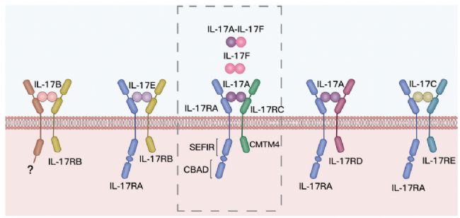 IL-17家族的成員都具有相似的蛋白質(zhì)結(jié)構(gòu),其中研究最多的是IL-17A和IL-17F。IL-17A和IL-17F作為該家族的“雙子星”,其結(jié)構(gòu)相似度高達(dá)55%,是炎癥反應(yīng)和自免疾病中的“主力軍”。IL-17A和IL-17F以同源二聚體或異源二聚體的形式,與IL-17RA和IL-17RC受體復(fù)合物結(jié)合,激活下游信號(hào)通路,引發(fā)一系列免疫反應(yīng)。