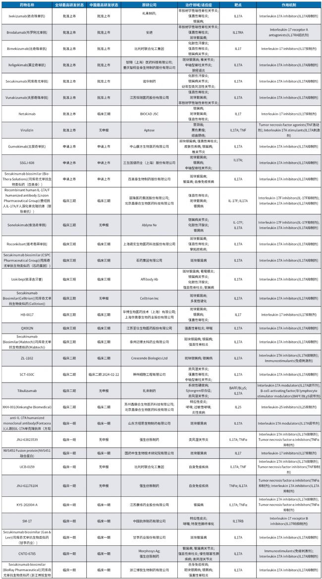 表. IL17靶點(diǎn)上市及臨床階段藥物統(tǒng)計(jì)