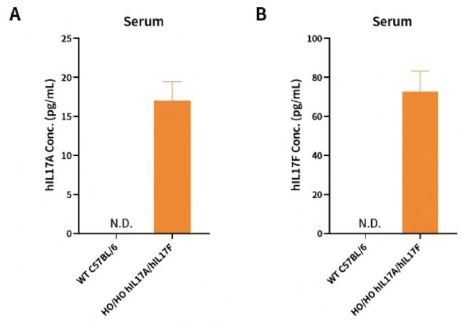 圖1. ELISA檢測(cè)hIL17A/hIL17F小鼠血清(A)人白細(xì)胞介素17A和(B)人白細(xì)胞介素17F的表達(dá)。