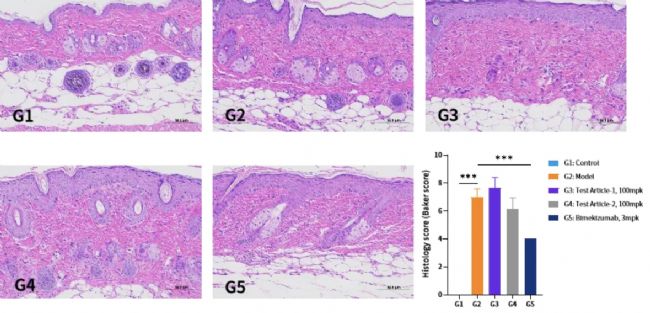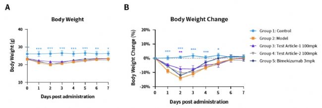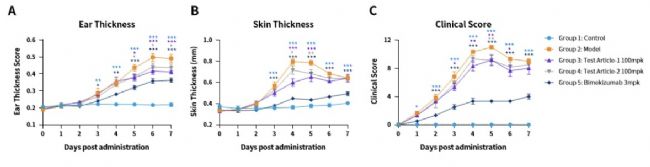 圖3. IMQ誘導(dǎo)的hIL17A/hIL17F小鼠銀屑病模型。(A)耳厚度變化;(B)皮膚厚度變化;(C)臨床評(píng)分。(測(cè)試藥物1/2來(lái)自于合作伙伴)
