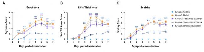 圖4. IMQ誘導(dǎo)的hIL17A/hIL17F小鼠銀屑病模型。(A)紅斑評(píng)分;(B)皮膚厚度評(píng)分;(C)鱗屑評(píng)分。(測(cè)試藥物1/2來(lái)自于合作伙伴)