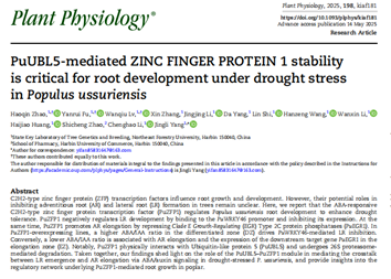 近日,東北林業大學-楊靜莉研究團隊在Plant Physiology(IF=6.5)發表題為PuUBL5-mediated ZINC FINGER PROTEIN 1 stability is critical for root development under drought stress in Populus ussuriensis的研究論文,該研究借助DAP-seq技術揭示了楊樹通過“分子開關”PuZFP1協調側根抑制與不定根伸長的抗旱策略,為抗旱林木的遺傳改良提供了新的理論依據。