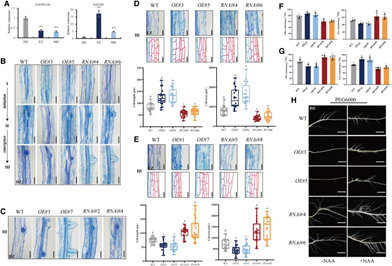 PuZFP1含有典型的C2H2鋅指結構域(氨基酸43-65)和一個C端高度保守的EAR抑制基序(DLSLRL),與擬南芥AtZP1高度同源(結構相似性>60%),定位在細胞核與細胞質。RT-qPCR和啟動子驅動的GUS染色結果顯示,干旱和ABA處理顯著誘導PuZFP1表達,并且在于根系分化區(DZ)和伸長區(EZ)特異性表達,與側根發生和不定根伸長區域重疊。酵母轉錄激活實驗和Gal4-GUS/LUC系統結果表明,PuZFP1是轉錄抑制因子,并且EAR基序是PuZFP1發揮轉錄抑制功能的必需結構。通過構建PuZFP1過表達(OE)和RNA干擾(RNAi)株系,發現PuZFP1負調控側根(LR)形成,正調控不定根(AR)伸長,在楊樹根系響應干旱脅迫中發揮關鍵調控作用。