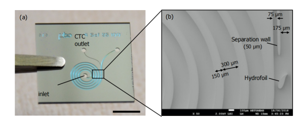 (a)在螺旋通道下游的四個環和液壓層的制造硅/玻璃芯片。 通過使用硅的深反應式離子蝕刻(DRIE)對通道進行模式化,并通過陽極粘結用玻璃密封。指示CTC和廢物出口和樣品入口。(b)帶有HY的部分的SEM圖像