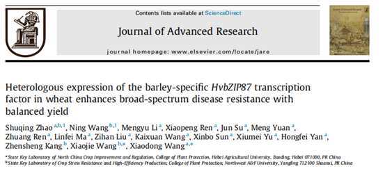 2025年5月6日,河北農大植物保護學院王逍冬教授團隊在Journal of Advanced Research(IF=11.4)發表了題為Heterologous expression of the arley-specific HvbZIP87 transcription factor in wheat enhances broad-spectrum disease resistance with balanced yield的研究論文。該研究揭示了大麥轉錄因子HvbZIP87在小麥中異源表達可增強廣譜抗病性并平衡產量的分子機制,本文借助DAP-seq技術系統挖掘了HvbZIP87的轉錄調控網絡,鑒定出其直接結合的順式作用元件及調控的PR基因、鋅離子轉運相關基因,為小麥抗病高產的分子育種改良提供了重要理論依據和基因資源。