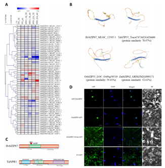 本研究通過對大麥轉基因系(wNPR1-OE和HvNPR1-Kd)在丁香假單胞菌DC3000觸發的SAR反應中的轉錄組數據分析,發現bZIP轉錄因子基因Novel07221(HvbZIP87)在系統獲得抗性(SAR)過程中被誘導表達,且在HvNPR1沉默株系中表達顯著上調。系統發育分析顯示,HvbZIP87是大麥特異性基因,在禾本科其他作物中無近緣同源基因,其與小麥、水稻、玉米同源蛋白結構差異顯著。HvbZIP87包含一個核定位信號(NLS,71-77氨基酸)和一個保守的bZIP結構域(pfam07716,67-132氨基酸),亞細胞定位實驗證實其定位于細胞核。NLS 突變后定位至細胞質,表明NLS對核定位必需且充分。