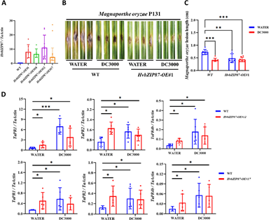為探究HvbZIP87功能,作者構建了過表達HvbZIP87的轉基因小麥株系HvbZIP87-OE。qRT-PCR檢測顯示,HvbZIP87表達量是內源TaActin基因的8-12倍,而野生型中無該基因表達。在誘導SAR反應的相鄰區域接種稻瘟病菌后,發現HvbZIP87-OE小麥病斑面積顯著變小。進一步qRT-PCR分析發現,HvbZIP87-OE小麥中致病性相關的(PR)基因表達水平高于野生型,表明該基因通過激活防御相關的轉錄反應增強抗性。