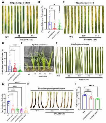 圖3. HvbZIP87-OE轉基因小麥株系的廣譜抗病性。