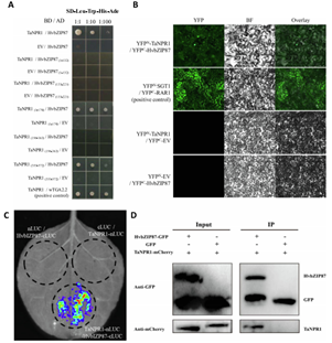 研究通過HvbZIP87-mCherry與TaNPR1-GFP融合蛋白的共定位實驗發現,兩者在細胞核內共定位,表明兩者可能存在互作。酵母雙雜交實驗證實HvbZIP87與TaNPR1直接互作,互作區域為TaNPR1的BTB/POZ域(1-170氨基酸)和NPR1/NIM1樣域(355-572氨基酸),且HvbZIP87的bZIP域不參與互作。進一步利用BiFC、LCA和免疫共沉淀實驗,驗證了兩者在植物體內的物理結合,揭示了HvbZIP87與TaNPR1獨特的互作機制。