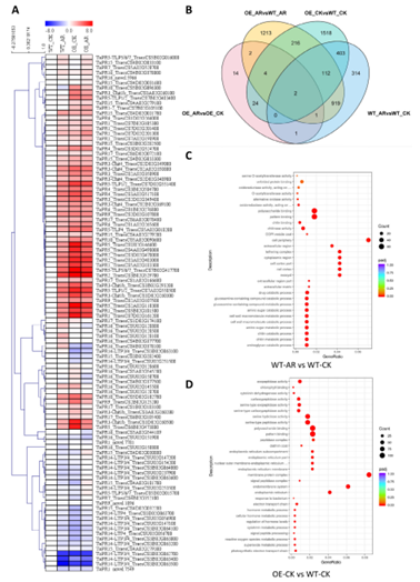 為解析HvbZIP87增強抗性的分子機制,對誘導SAR反應的轉基因及野生型小麥進行RNA-seq分析。結果顯示,HvbZIP87-OE中約2/3的PR基因顯著上調,表明其可獨立于病原體激活SAR反應。差異基因分析表明,“WT_AR vs WT_CK”與“OE_CK vs WT_CK”共享517個DEGs,GO和KEGG富集顯示其參與多糖結合、植物-病原體互作、Ca²⁺信號及ETI通路。植物激素分析發現,HvbZIP87抑制SA、GA的誘導積累,卻特異性促進ABA積累,并影響IAA、CTK、JA等通路。