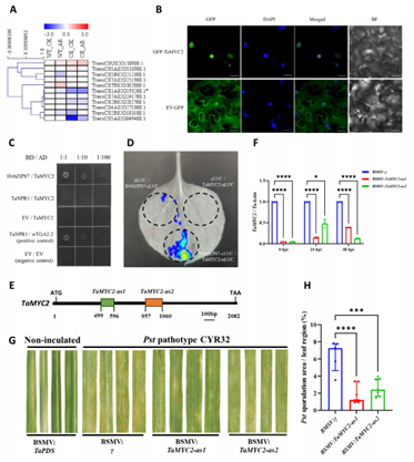 研究利用Y2H文庫篩選了72個與HvbZIP87互作的新候選蛋白,其中核定位的TaMYC2在HvbZIP87-OE株系中表達顯著下調。Y2H和LCA實驗證實HvbZIP87與TaMYC2直接互作,而TaMYC2與TaNPR1無互作。通過VIGS沉默TaMYC2后,小麥對條銹病的抗性顯著增強,表現為孢子形成減少、病斑癥狀減輕,證實TaMYC2是植物防御的負調控因子。