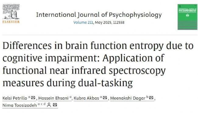 Kelsi Petrillo, Hossein Ehsani, Kubra Akbas, Meenakshi Dagar, Nima Toosizadeh, Differences in brain function entropy due to cognitive impairment: Application of functional near infrared spectroscopy measures during dual-tasking, International Journal of Psychophysiology, 211, 2025, 112558, 0167-8760.