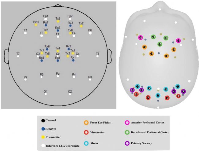 圖2. 近紅外光極排布以及對應腦區