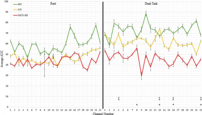 圖3. 靜息(rest)和雙任務(Dual-Task)條件下各組所有通道的平均 AUC 值。三組間(HY vs. CN vs. MCI/AD)的顯著差異以星號(* 表示p<0.05)標注,兩組間(CN vs. MCI/AD)的顯著差異以雙十字號(‡)標注