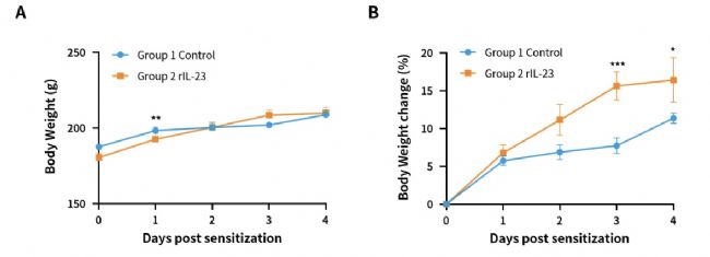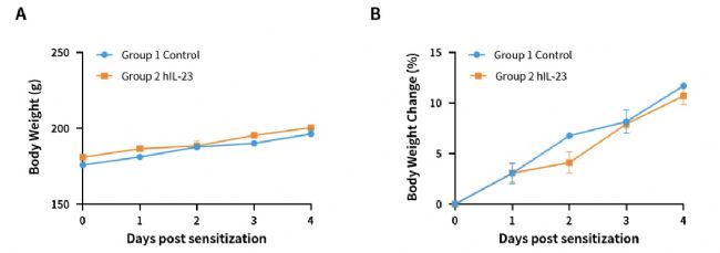圖5. Human IL-23因子誘導的大鼠銀屑病模型。(A)體重;(B)體重變化。