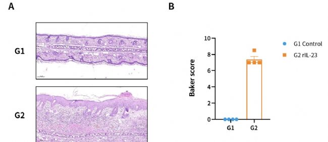 圖8. Human IL-23因子誘導的大鼠銀屑病模型。(A)H&E染色代表圖;(B)Baker評分。