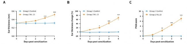 圖6. Human IL-23因子誘導的大鼠銀屑病模型。(A)耳厚度;(B)耳厚度變化;(C)銀屑病面積和嚴重程度指數。