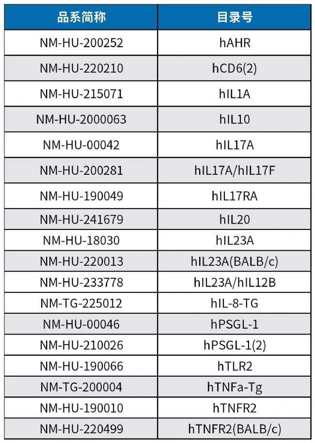 除上述模型外,南模生物還可提供銀屑病相關靶點人源化小鼠模型,助力新藥研發。部分相關品系如下表: