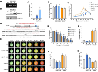 先前研究發現AdZAT5是獼猴桃果實軟化的潛在調節因子。本研究通過系統發育分析,在番茄中找到其同源基因SlZAT5,該基因含兩個保守C2H2結構域和EAR基序。RT-qPCR結果表明SlZAT5在番茄各組織均有表達,果實未成熟綠色階段表達較高、成熟時下降。SlZAT5突變體開花至破口期縮短至約43天,乙烯峰值提前、硬度下降、類胡蘿卜素積累高;SlZAT5過表達株系則延長至約47天,乙烯峰值延遲、硬度增加、類胡蘿卜素積累低,表明SlZAT5負調控番茄果實成熟。