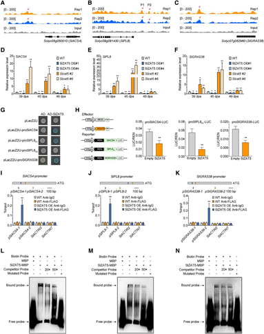 為了確定SlZAT5在果實成熟過程中的直接轉錄靶標,作者通過DAP-seq分析,在7754個基因中檢測到SlZAT5結合峰(高可信度區域)。結合RNA-seq數據,篩選出1511個受SlZAT5調控的成熟相關基因,其中包括乙烯合成基因SlACS4、細胞壁降解基因SlPL8和轉錄因子基因SlGRAS38等關鍵基因,這些基因的啟動子區域均有SlZAT5結合位點富集。進一步通過RT-qPCR、Y1H、Dual-Luc、ChIP-qPCR和EMSA多種實驗證實,SlZAT5可直接結合上述基因啟動子并抑制其表達。研究表明SlZAT5通過結合關鍵基因啟動子調控果實成熟過程。
