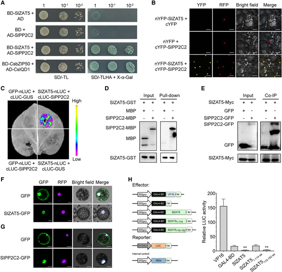 圖3. 轉錄抑制因子SlZAT5與SlPP2C2存在物理相互作用。