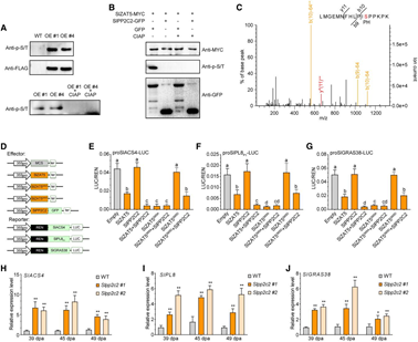 為探究SlZAT5是否受SlPP2C2翻譯后修飾,通過WB檢測發現,SlZAT5過表達樣本中存在SlZAT5蛋白及其磷酸化形式,經磷酸酶處理后磷酸化信號消失;SlPP2C2-GFP與SlZAT5-MYC共表達時,未檢測到磷酸化條帶。進一步通過LC-MS/MS分析,確定了Ser-65為磷酸化位點。雙熒光素酶報告實驗表明,SlZAT5及去磷酸化突變體S65A可抑制下游基因活性,而磷酸化突變體S65D無此作用。此外,敲除SlPP2C2顯著上調目標基因轉錄水平。以上結果表明,SlPP2C2通過去磷酸化SlZAT5的Ser-65位點,調控其對下游成熟相關基因的轉錄抑制活性。